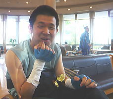 その後の某日。 群馬の「ふれ合いプラザ」で練習。 写真は練習前にカロリーメイトを食う川下君。新しく 「ポテト味」が出たんだってな、もう食った?みたいな話で盛り上がる。