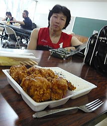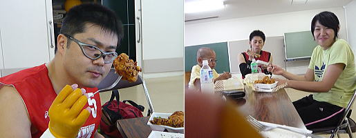 大きいというかズッシリ重い。女の子なのに唐揚げ弁当頼んじゃったのね。かなり困惑顔。