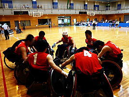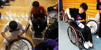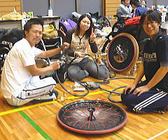 | 試合の準備に取り掛かる。パンクの修理に悪戦苦闘。スピナジータイプはやりにくい。