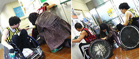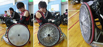 ポジションが悪く、車いす操作の悪い選手がいたので、シートセッティングのアドバイス。少しは良くなったはず。お代は要りません。 |