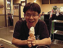 ストロベリーバニラソフトを食って大満足の川下君。