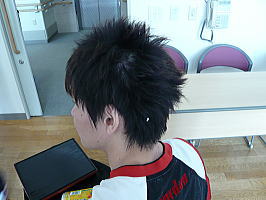 羽賀ちゃんの髪の毛にご飯粒発見!白い点がソレ。