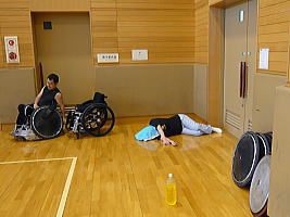 体育館の片隅で眠る厚子さん。