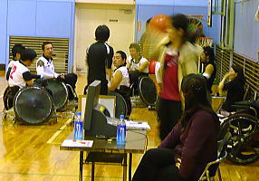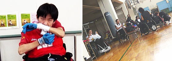 テーピングを巻く川下君と義塾メンバーの準備風景。