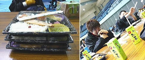 続々と選手が集合。福井さんは試合に向けて栄養補給。