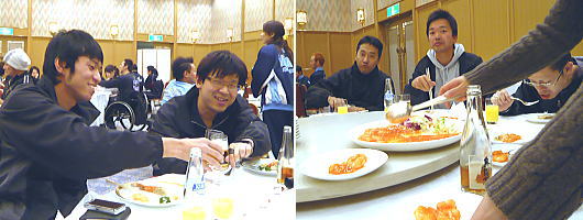 落合君と乾杯する川下君。 / エビチリは辛くて食べられない残念な宮澤さん。