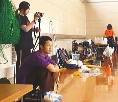 疲れたのか、何か失敗したのか、ガックリ肩を落とす福井さん。 なぜか菊池君も一緒になって肩を落とす。 良く見ると、ユニフォームの肩の所で縮め縫い処理が…。 小さいサイズのユニフォームを買ったのにまだ大きかったらしい。