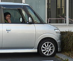 体育館前の駐車場で一服中の義塾の生方君。 植え込みへ接触ギリギリの寸止めで駐車。