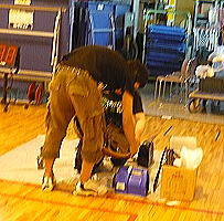 急きょ、体育館のサイドスペースに選手の荷物を置くことにして設営。臨機応変て奴です。