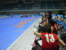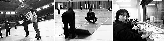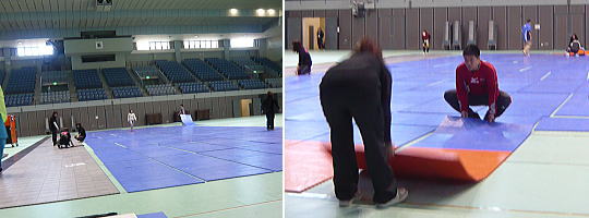 今大会は初の試みとして床への傷防止のため「スポーツコート」というものを床に敷き詰める。その為、設営や撤収に少々時間が…。