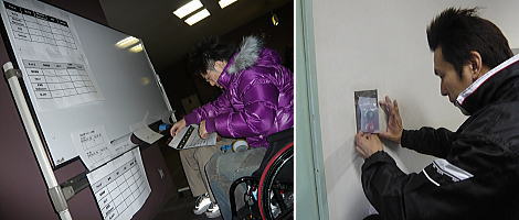床の作業をしている間、車いすの面々は会場の小物を作成。