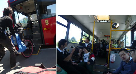 車いすでも乗りやすいバス。 / 手前が車いすスペース。