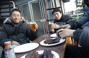 暖かいので外でお昼。
