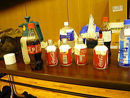 ブラストベンチの机にズラリと並んだコーラ。マラソンランナーは競技中に炭酸を抜いたコーラを飲むとは聞きますが…。 たくさん飲むと骨が溶けるよ <昭和の発想