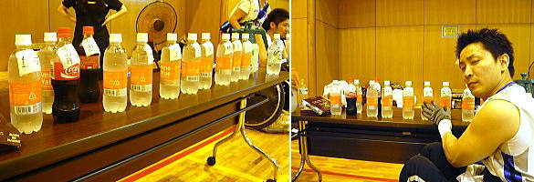 ジェネシスベンチにズラリと並んだ「アミノバリュー」 前回のブラストといい、チームの味の趣向というのは似るのだろうか。あっ、コーラ派も発見。