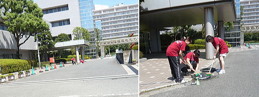 平井君が譲ってもらった中古のタイヤ。そのスポークカバーが松やにでベッタベタだったらしい。このままでは試合に出れないということで水場を探して緊急清掃。