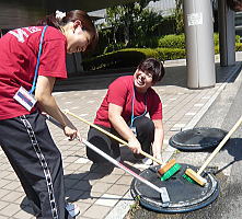 床掃除用のデッキブラシを持って外へ!? |