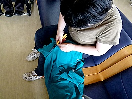 「じゃぁ、やっちゃって!」 と、千葉ちゃんにハサミを渡す福井さん。