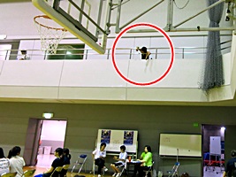 2階に目を向けると河ちゃん発見。 上から試合を見ているようだが… ん!?