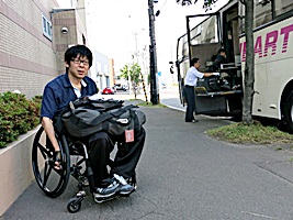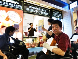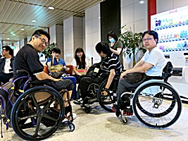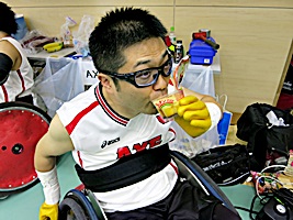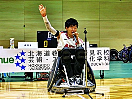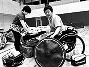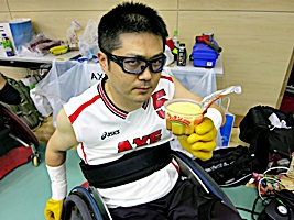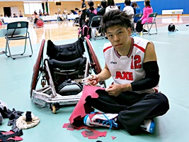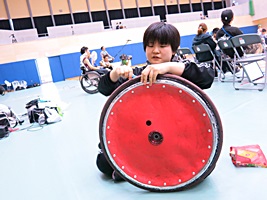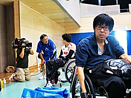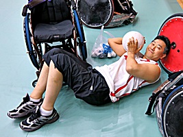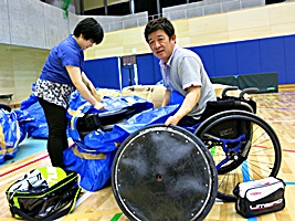 会場に着くなり床に降りてトレーニングを始める福井さん。 やる気満々です。 ※車いすから落ちたわけではありません。…ということで。
