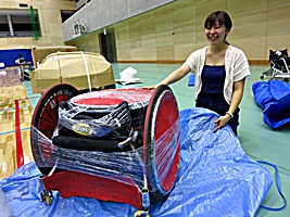 小一時間で大学に到着。着いたら即梱包外し。 というか、とてもきれいな体育館。 床が光ってるぜ! それもそのはず、出来立てホヤホヤなんですって。