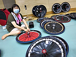 千葉ちゃんはパンク修理中。 試合とは関係ない原因によるパンクにご立腹。怒らないで〜。