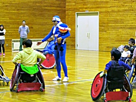 公開練習試合、パラスポーツ体験会が行われました。 会場には様々なスポーツの応援団長、青いタイツのニッポンマンが来てました。テンションがとても高いです。